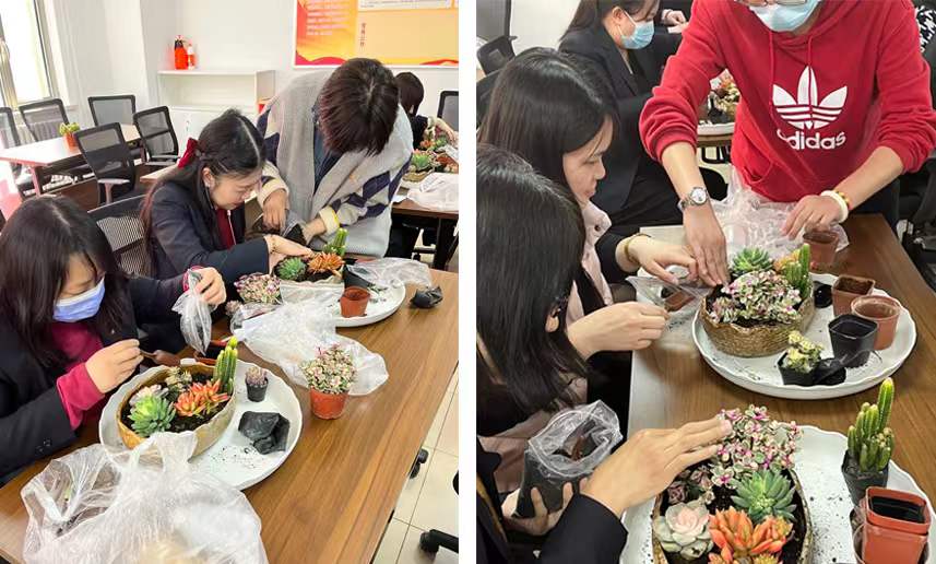 此次活動聘請了專業老師對(duì)多肉花卉的習性、寓意以及插花技巧等方面(miàn)知識進(jìn)行了耐心講解并現場指導了花藝制作,女職工們用不同種(zhǒng)類的多肉組合搭配出不同形式的作品,給一盆盆小多肉賦予了新的生命。