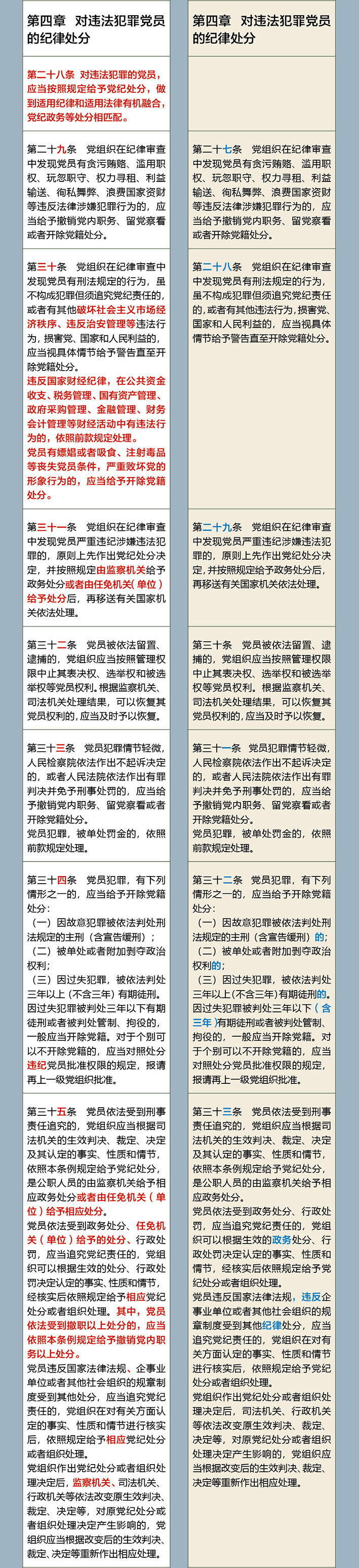 《中國(guó)共産黨紀律處分條例》修訂前後(hòu)對(duì)照表第三章、第四章、第五章